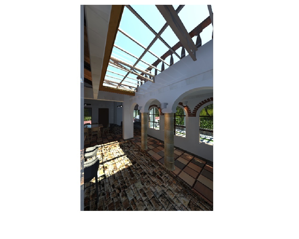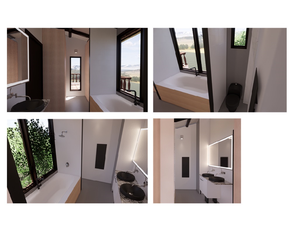 Development of a countryside house on a mid-block lot. Spaces include: living room, dining room, office, storage room, kitchen, stairs, interior patio, study, garage for 2 cars, 4 bedrooms, 2 bathrooms, laundry area, front and rear balconies. Structure made of masonry and concrete.